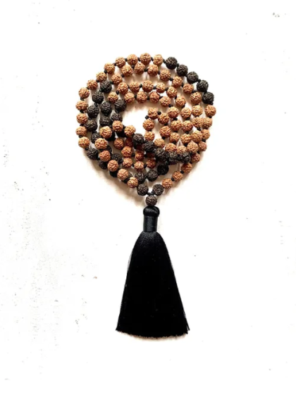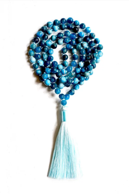 Questo mala è composto da 108 perle di pietra apatite di 6 mm di diametro e un pompon di seta. È legato tra ogni perla per incoraggiare il conteggio durante la pratica del japa.
